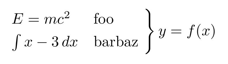 \int x-3\, dx & \text{barbaz}defines the second case, grouping the integral expression with the label “barbaz.” - The brace will appear on the right side of the cases, with the variable